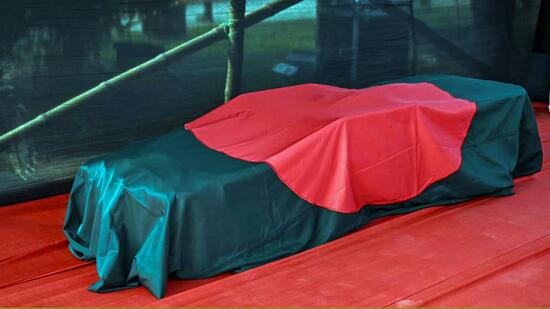 The Bangladesh national flag wrapped around the body of Sharif Osman Hadi, a key leader in the protests against Sheikh Hasina, who died on 18 December 2025. (Bangladesh handout)
