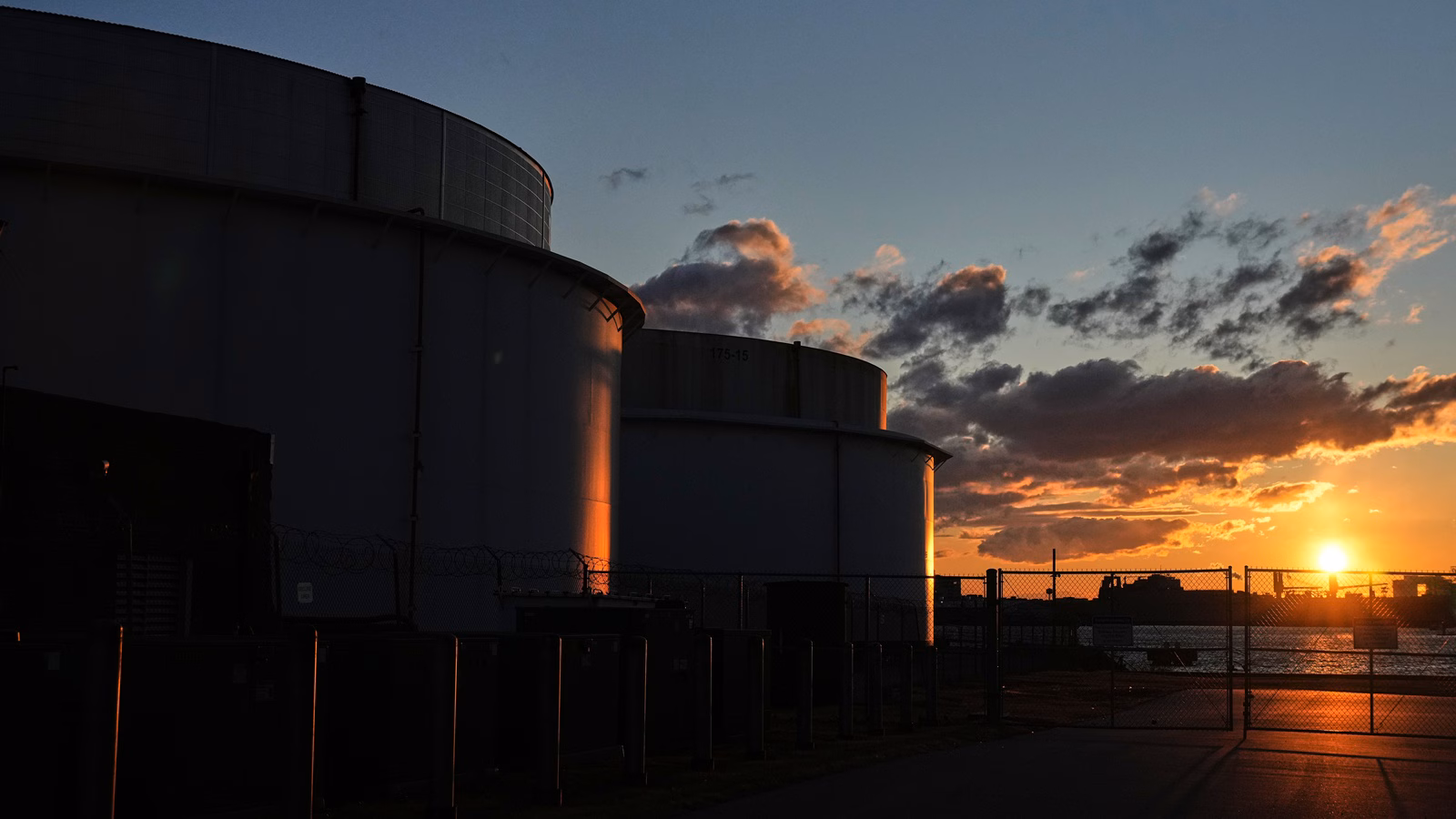 Crude oil storage tanks are seen, Tuesday, March 17, 2026, in Baltimore. (AP Photograph)