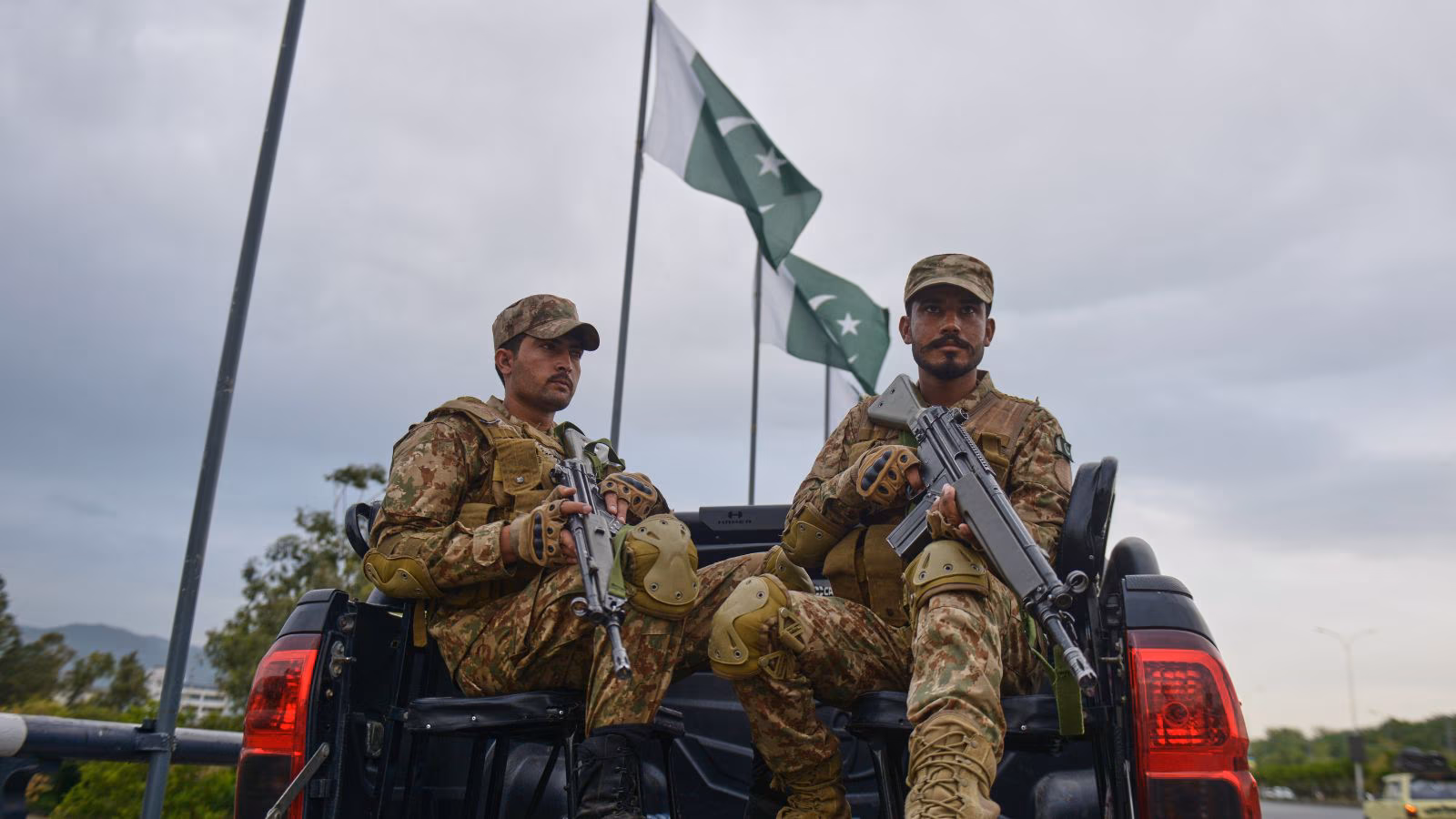 Military troopers take positions in an overhead bridge to make sure safety in Islamabad, Pakistan. (Photograph: AP)